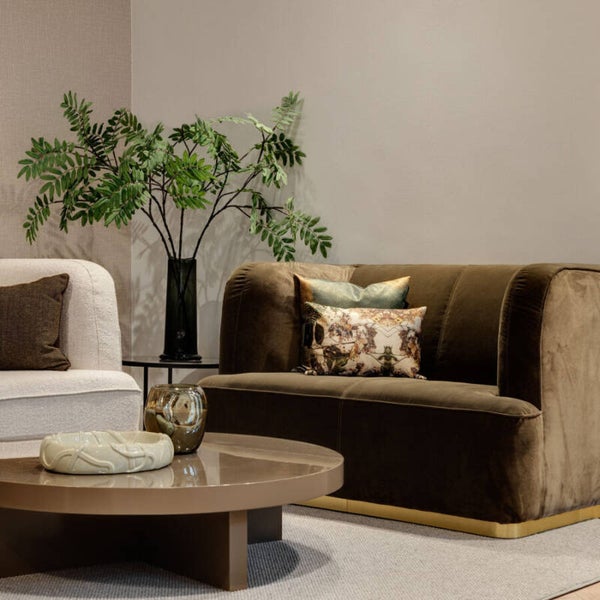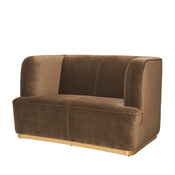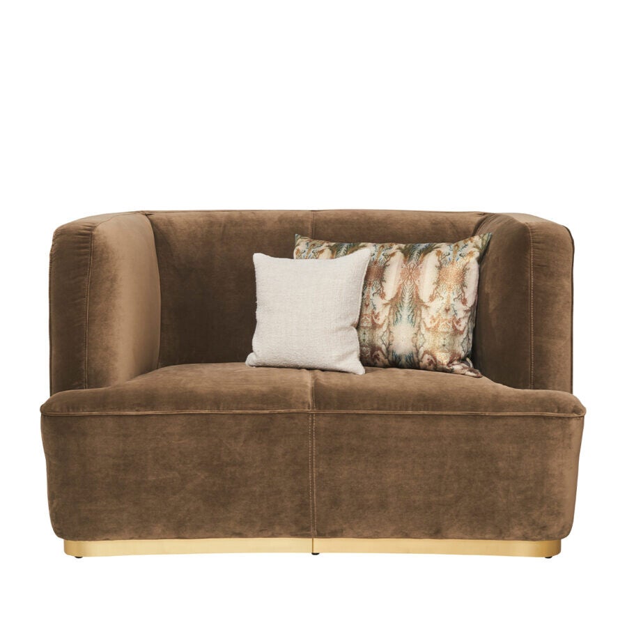 Lichtgebogen fauteuil met een plint. De Parker heeft een vaste zit en de messing plint geeft het een luxe uitstraling. De plint kan ook in zilver of een RAL-kleur, waardoor je deze kunt afstemmen op de bekleding en het kleurenpalet van je interieur.