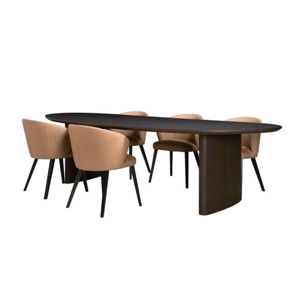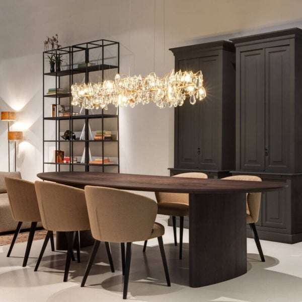 Stijlvolle eetkamertafel met een organisch blad en twee bolle ellips poten. Combineer de Vario eetkamertafel met de andere meubelen uit de Vario collectie.