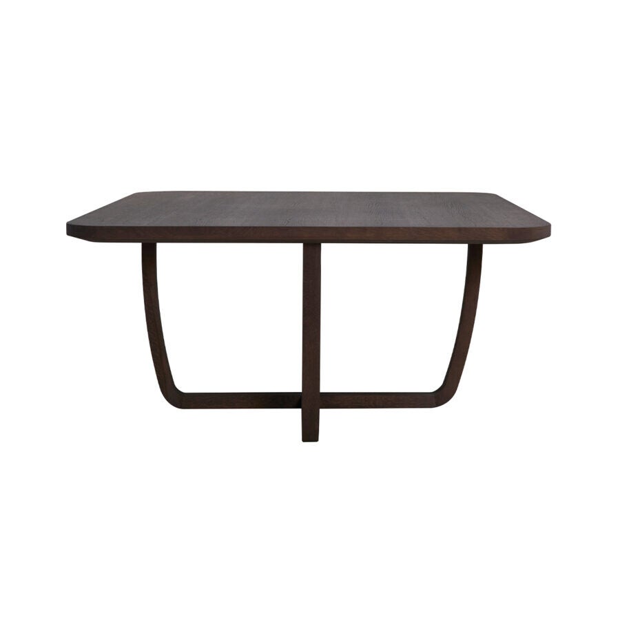 Vierkante eetkamertafel met een open onderstel. Door de lijnen in het onderstel en de afgeronde hoeken heeft de tafel een zachte uitstraling.