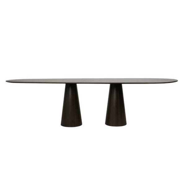 Eetkamertafel met twee cilinderpoten. Het dunne verjongde blad heeft een organische vorm en geeft dit model een unieke uitstraling. De Cone eetkamertafel is ook verkrijgbaar als een rond, ovaal en Deens ovaal model.