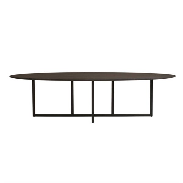 Ovale eetkamertafel met een kruispoot. Het open onderstel is van metaal en geeft de tafel een luchtige uitstraling. Het blad is mogelijk in diverse afwerkingen.