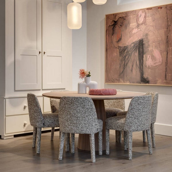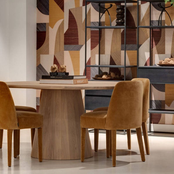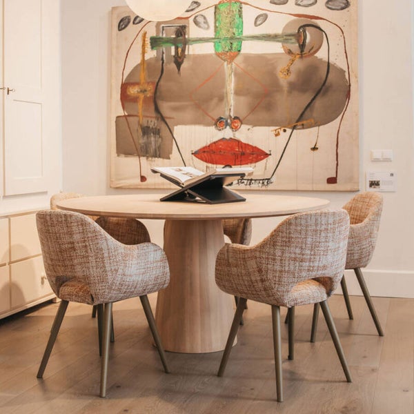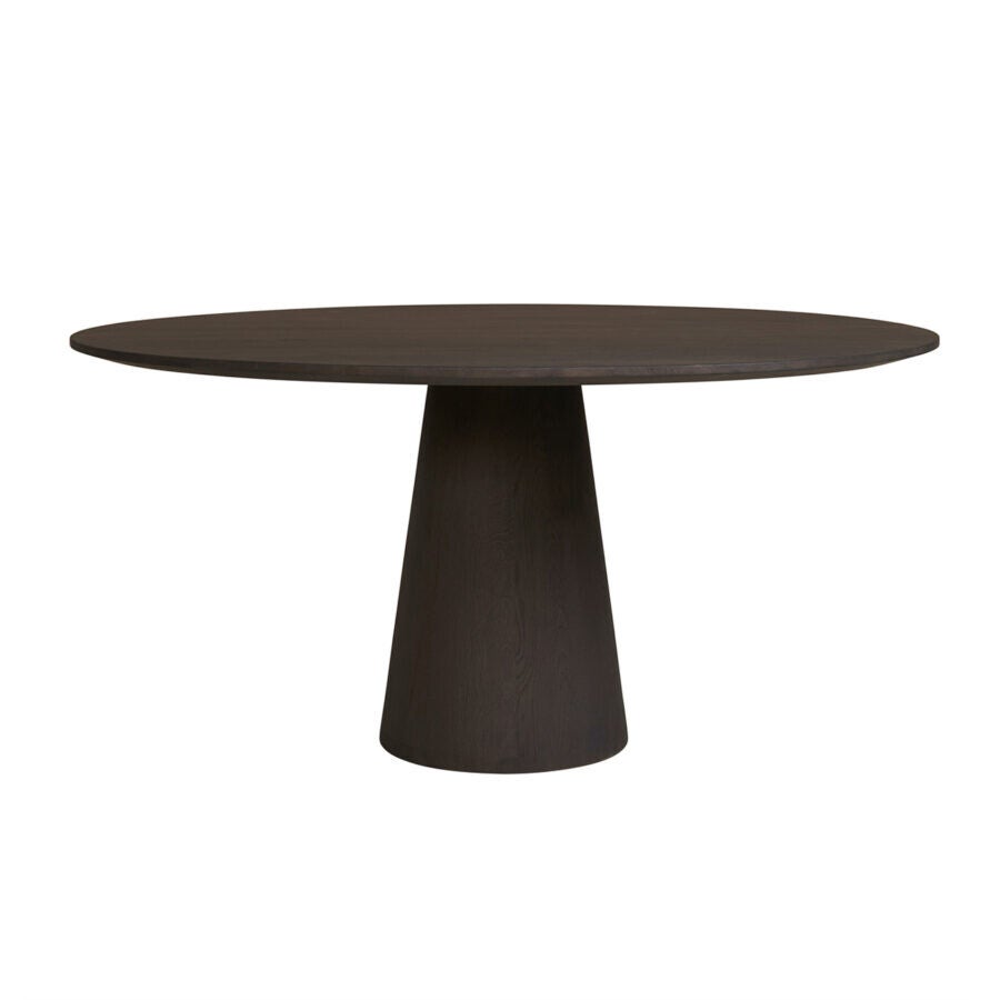 Ronde eetkamertafel met een cilinderpoot. De combinatie van het dunne blad met de poot geeft dit model een unieke uitstraling. De Cone eetkamertafel is ook verkrijgbaar met een langwerpig, ovaal, organisch of langwerpig blad.