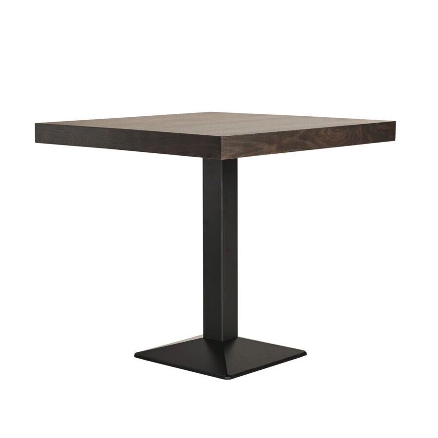 Vierkante eetkamertafel met metalen onderstel. Het blad is mogelijk in diverse afwerkingen. De Bistro eetkamertafel is ook verkrijgbaar in andere uitvoeringen.
