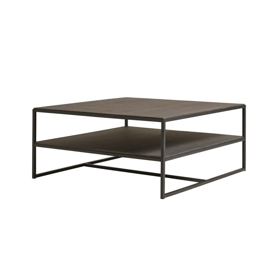 Vierkante salontafel met eiken bladen en metalen frame. Het schap biedt extra ruimte voor tijdschriften, accessoires of een afstandsbediening. De Fragile salontafel is verkrijgbaar in diverse uitvoeringen. Schuif de diverse varianten over elkaar heen voor een speels effect.