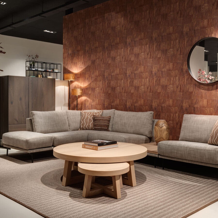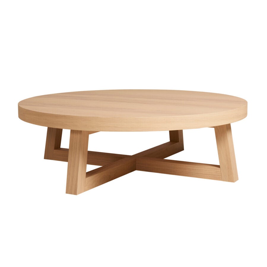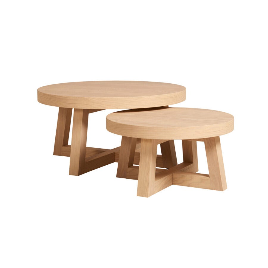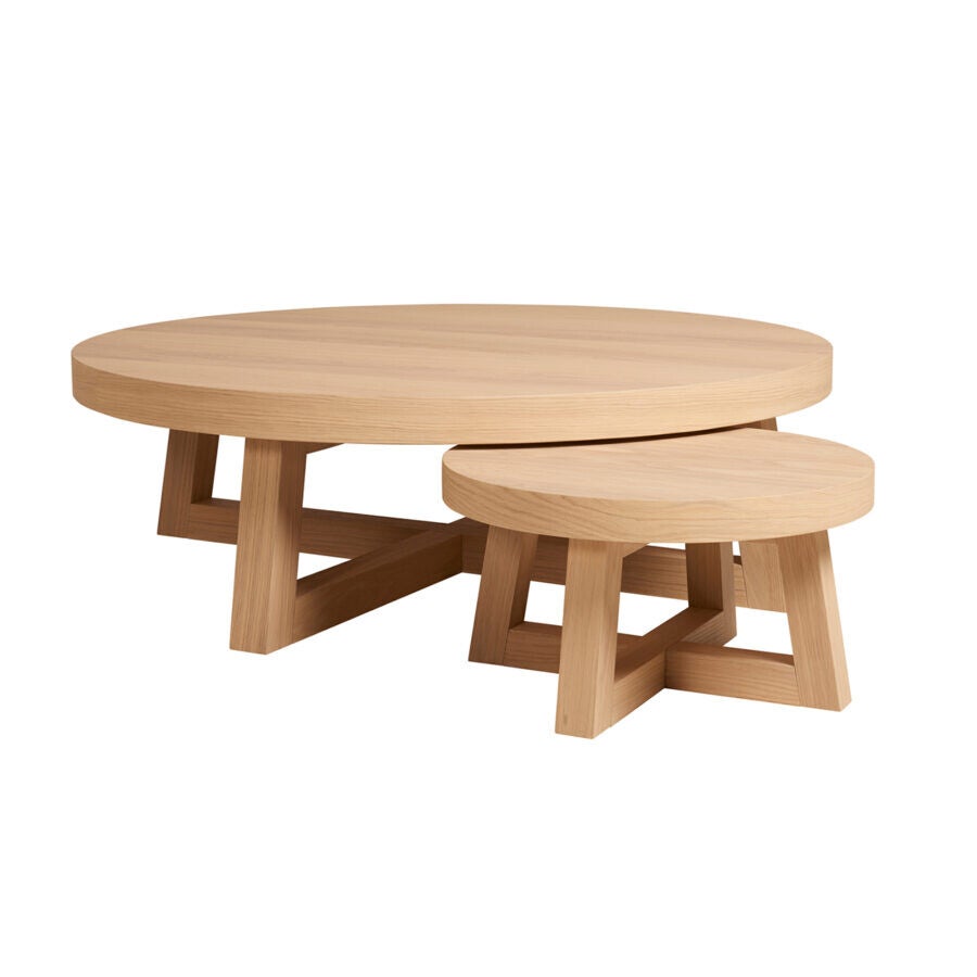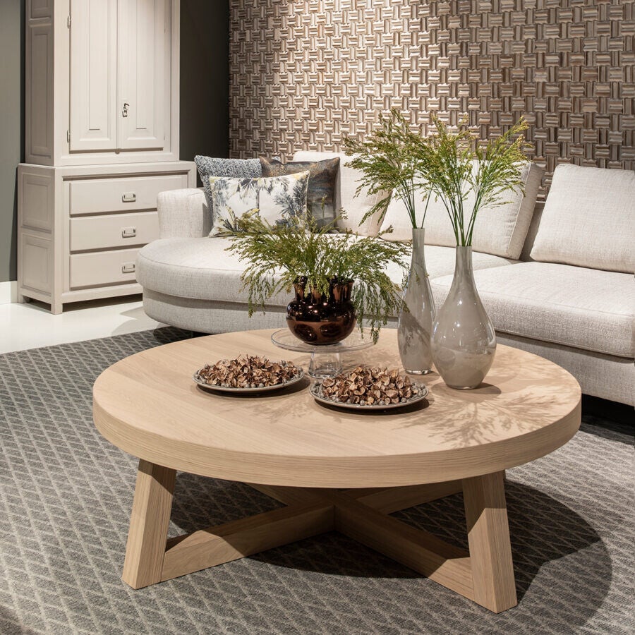 Ronde salontafel met open vierpoot. Dankzij het ronde blad en het open onderstel ontstaat er een speels effect. Je kunt de verschillende formaten ook met elkaar combineren.