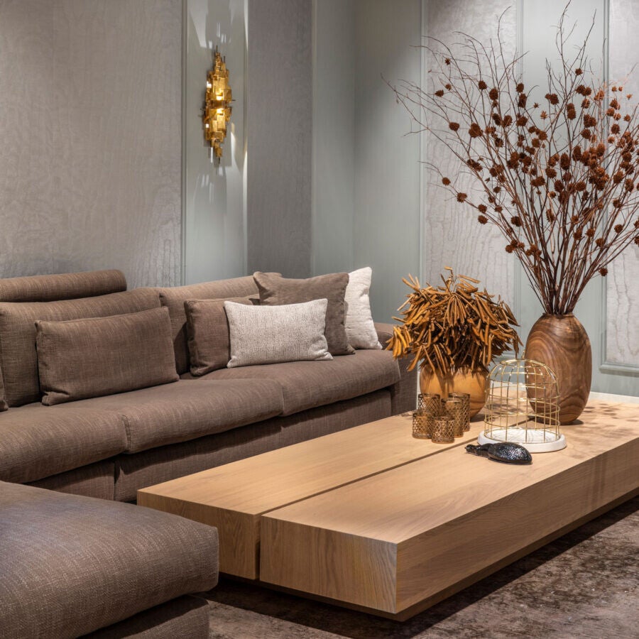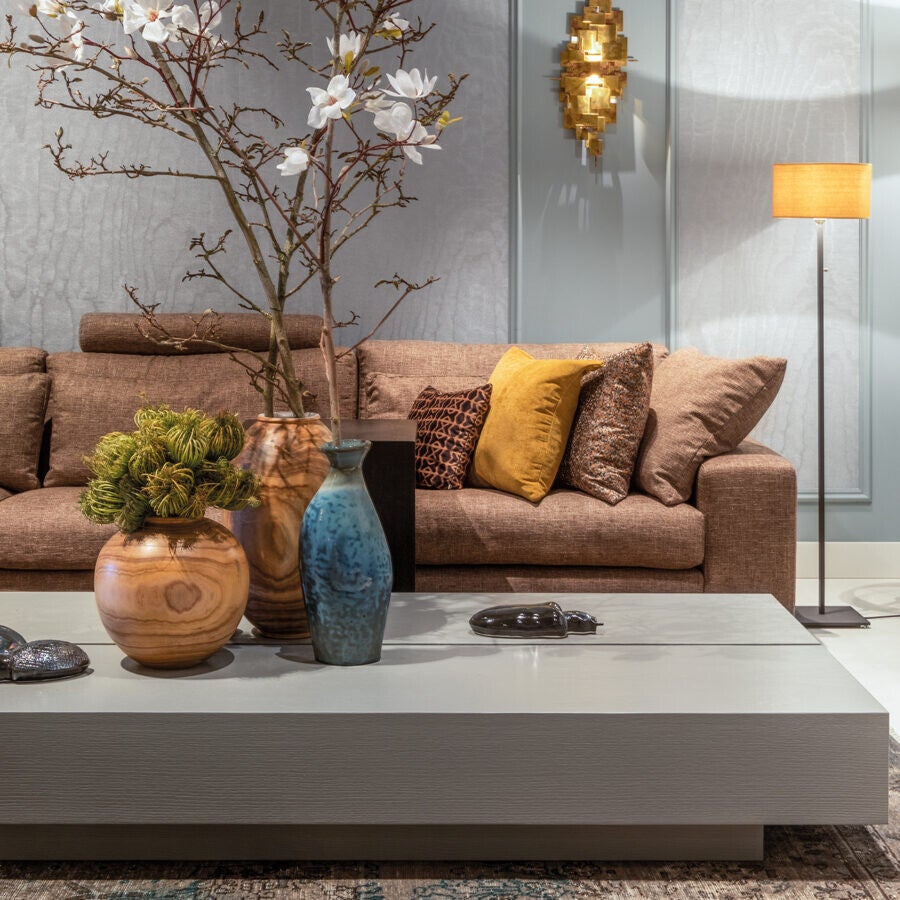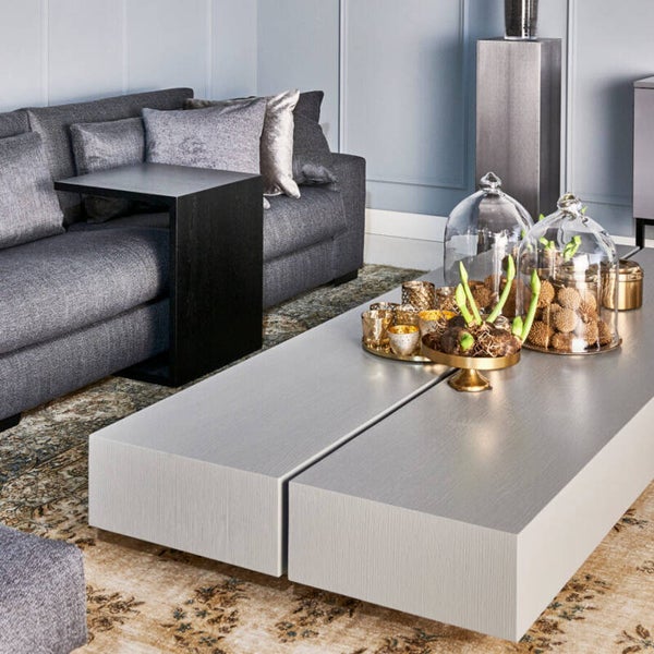 Langwerpige salontafel. Het is een zwevend model dat verkrijgbaar is in diverse afwerkingen. Hoewel het twee tafels lijken, heeft het model één basis dat zo samen een geheel vormt.