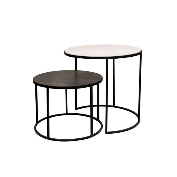 Ronde lage bijzettafel met een stenen blad en een metalen onderstel. Je kunt dit model goed combineren met een andere tafel uit de Fragile collectie. Kies bijvoorbeeld voor de bijzettafel met een open zijde en een eiken blad, voor een samenspel in hoogtes en materialen.