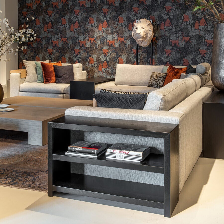 Open console met een schap voor naast de bank. Ideaal om je magazines in op te bergen, maar ook voor verlichting en accessoires.