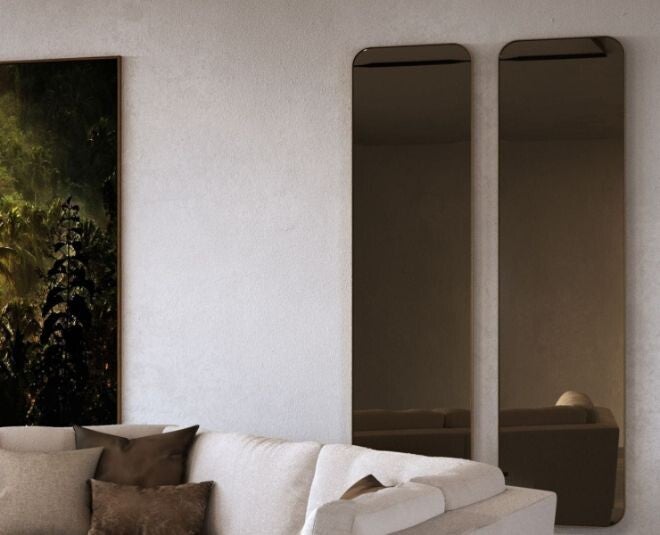 Het spiegelglas van Tortona mirror is omgeven door een subtiele rand van staal, beschikbaar in vier kleuren. De spiegel wordt standaard uitgevoerd in brown smoked glas. Bent u op zoek naar een unieke toevoeging, kies dan voor het spiegelglas in clear brown.