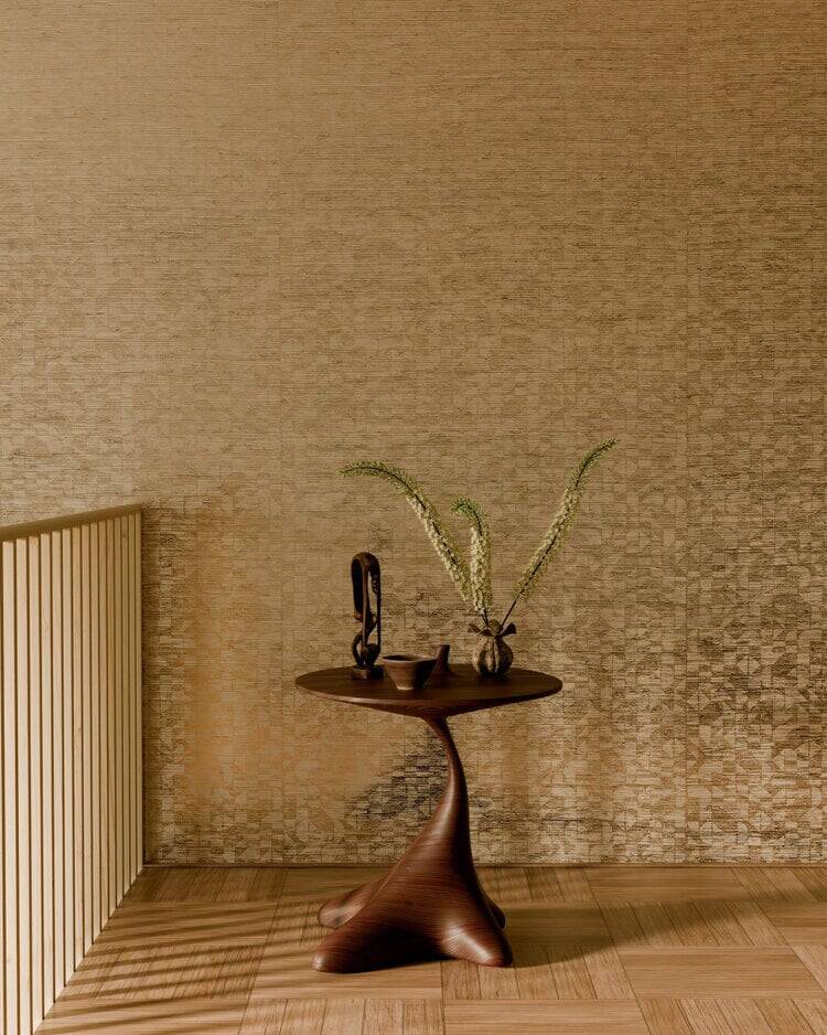 Dit dessin toont een geometrisch patroon, zorgvuldig geprint op natuurlijk gras. Een metaalkleurige folie als eindafwerking voegt extra luxe en glans toe. Het ontwerp is vernoemd naar de Cyperus marquisensis, een inheemse grassoort van de Marquesaseilanden, die deze creatie een exotisch en verfijnd karakter geeft.