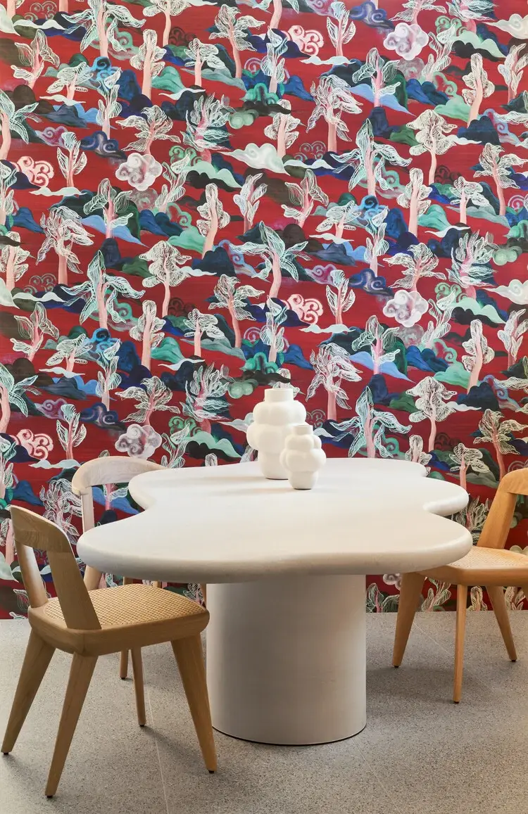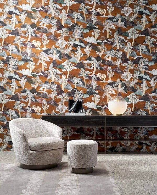 In dit dessin ontdek je heuvels en bomen onder een zachte wolkenhemel. Het is ontworpen in een typisch Aziatische tekenstijl en werd vernoemd naar het Sarandabos in India. Een erg toepasselijke naam, want Saranda betekent letterlijk ‘zevenhonderd heuvels’.