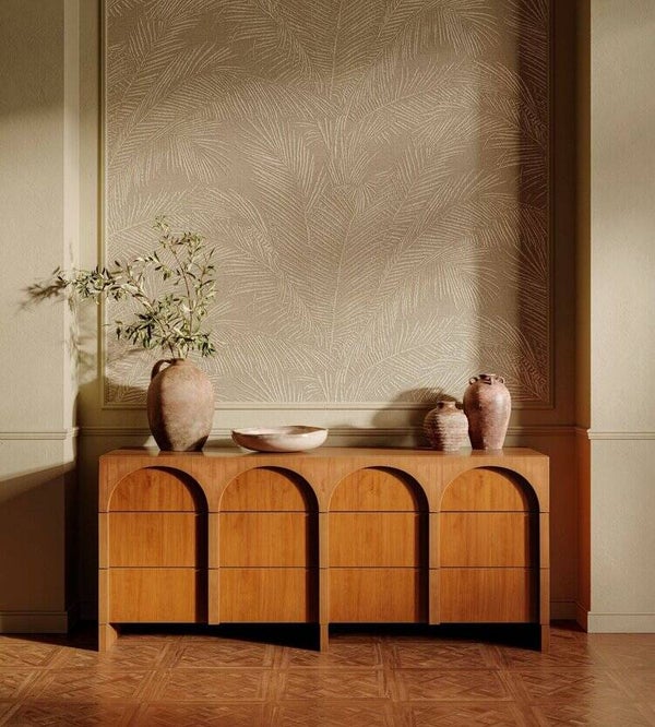 Het eiland Maui is een ware droombestemming, rijk aan watervallen, rotskusten, zandstranden en vooral palmbomen. Het vormde de inspiratie voor dit ontwerp, waarbij de elegante palmbladeren met raffia geborduurd werden op stijlvol linnen. Het Maui behang is een zeer realistische weergave van dit handwerk.