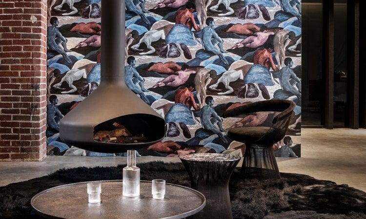 Het Toscaanse dorp Saturnia is al sinds de tijd van de Romeinen gekend om haar warmwaterbronnen. Dit rustgevende tafereel illustreert badende personen in thermen. De onderliggende fil-à-fil techniek met zilver of goudfolie creëert naast reliëf een unieke schittering in het water. Een echt statement piece!