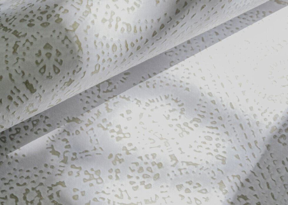 Voor Monochrome ontwikkelden we een nieuwe techniek waarbij we reliëf creëren met metaalinkten. De glanzende reliëfinkten worden op een matte of metallic ondergrond aangebracht. Dit proces geeft diepte aan de muurbekleding en brengt zo een nieuwe dimensie in je interieur. Om de exclusiviteit van deze techniek te benadrukken, zijn de dessins geïnspireerd op nobele materialen als hout, leder en edelmetaal.