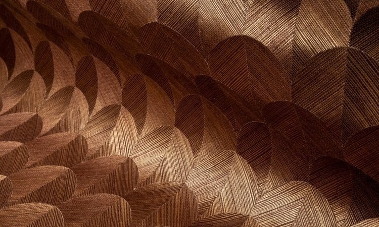 Het bijzondere aan deze muurbekleding is dat ze met de hand gemaakt is. De basis is een onregelmatig geweven sisal weefsel in één kleur. Doordat een van de draden een subtiele glans heeft, en de draaddikte van schering en inslag verschilt, zitten er zo al mooie kleurschakeringen in. Uit deze sisal wordt nu heel voorzichtig en heel nauwkeurig een motief gesneden. De uitgesneden elementen worden dan samengebracht en zo verlijmd in een patroon dat er een 'trompe-l'oeil' effect ontstaat. Door de weefselrichting onder een andere hoek te leggen, krijg je ongelooflijke effecten van diepte en reliëf.