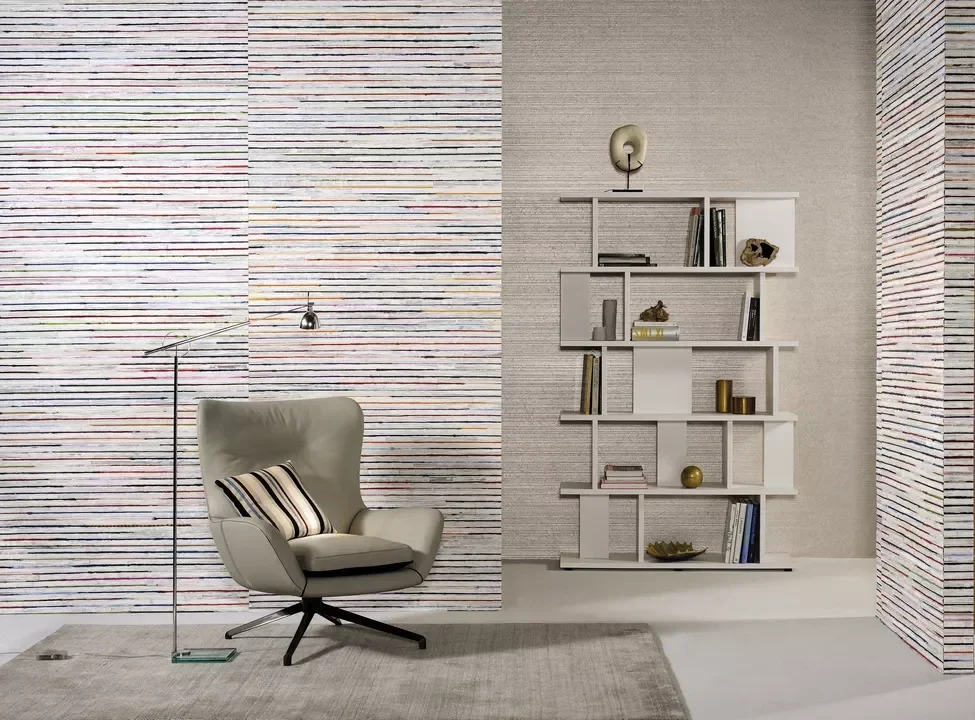 ARTE Seraya behang is gemaakt van geweven bakbak en sari-zijde: de bakbak (gedroogde bananenboom bast) kleuren worden vermengd tot oneindige reepjes sari-zijde. Elke meter van het product is uniek omdat de zijdekleuren elkaar afwisselen zonder te herhalen. Het gewenste resultaat is een adembenemend esthetisch product gemaakt van gerecycled textiel. Een echte smaakmaker!
