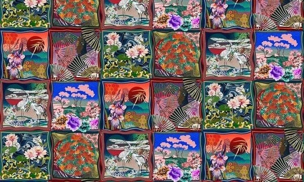 Zes zijden foulards met Oosterse taferelen zijn de inspiratiebron voor deze compositie. De kleurenexplosie is perfect in balans en creëert één harmonieus en panoramisch geheel.