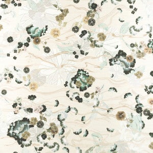 Dit tafereel van een Japanse vijver in bovenaanzicht weerspiegelt de weelderige natuurpracht van water. Laat je verrassen door de diepte in de tekening en ontdek het leven boven en onder water. Het textiel met zijdelook staat voor elegantie en verfijning.
