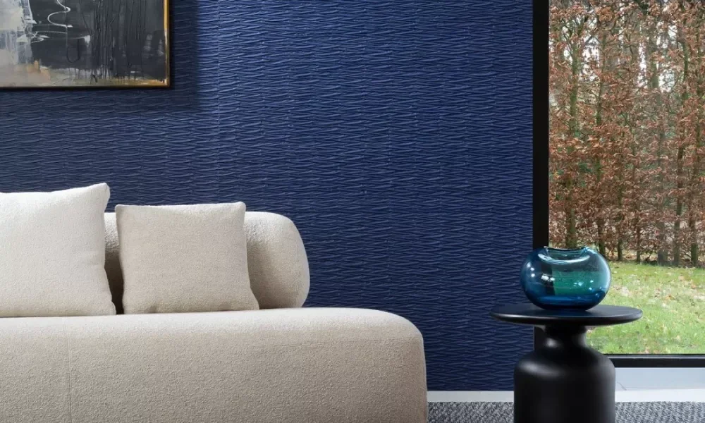 De imitatie van gevouwen papier weerspiegelt de rimpeling van bewegend water. De plooien creëren veel reliëf en het repetitieve karakter brengt rust en regelmaat. De luxueuze afwerking van de toplaag is een inkt van zijdeglans met een elegante zijdelook als resultaat.