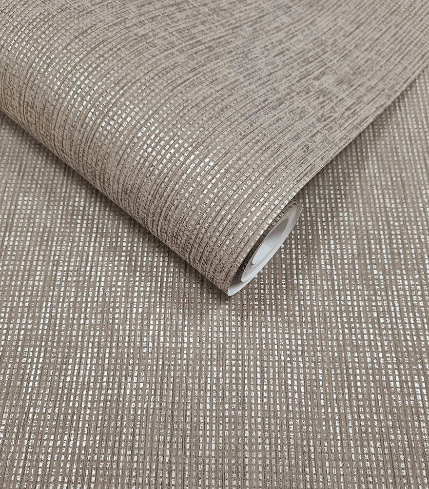 Geïnspireerd door de organische schoonheid van geweven stro, bootst deze textuur het gevoel van geweven vezels na en de achtergrond van metalen glans brengt een vleugje luxe. . PVC-vrije getextureerde wandbekleding.