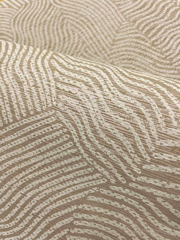 Tenere vangt de zachte vormen van het gegolfde oppervlak van de woestijn. Deze unieke patronen worden gevormd door richtingswindstoten die door de woestijn reizen. Dit getextureerde, golvende patroon bevindt zich op een verhoogde, tactiele lineaire achtergrond.