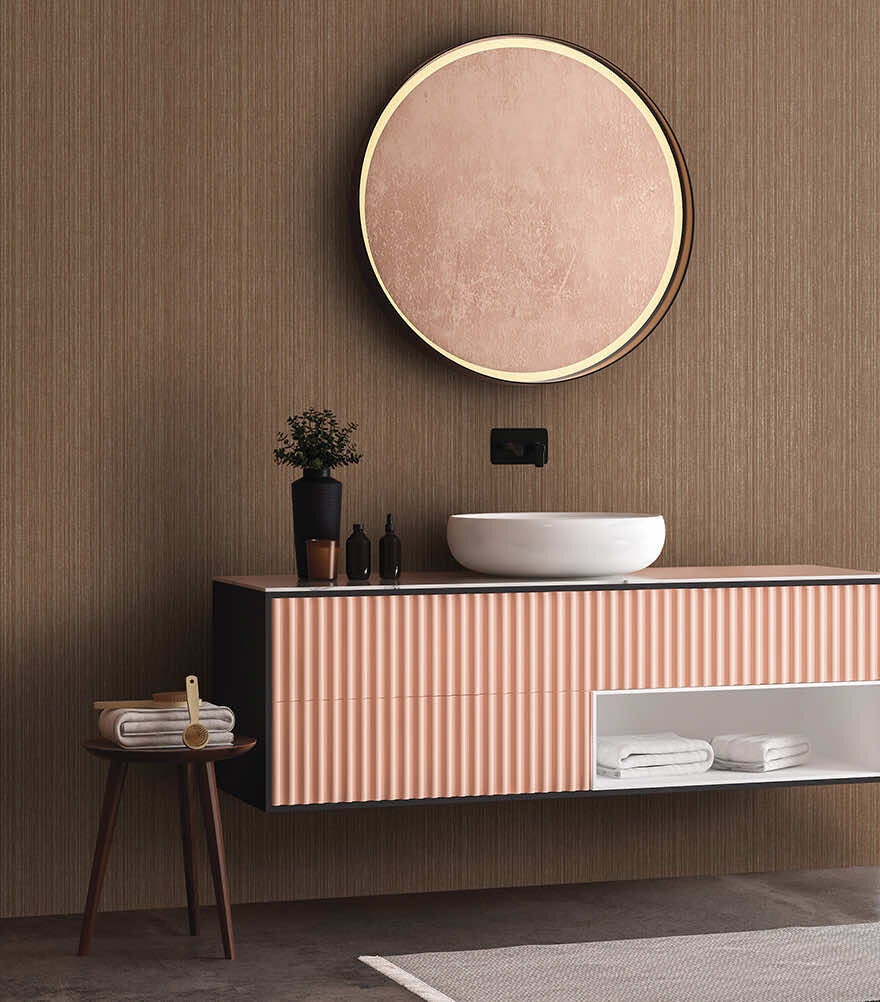 Een verfijnd gestreept ontwerp met fijne metalen lijnen en een verhoogde acryl chevrontextuur. De combinatie voegt zachte beweging, diepte en een moderne glans toe ideaal voor het creëren van een verfijnde, ingetogen muur.