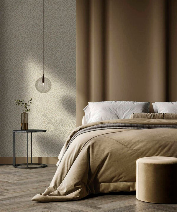 Een overal getextureerde wandbekleding, verrijkt met metalen luipaardvlekken die over een verhoogde acrylbasis vallen. De combinatie van glinsterend patroon en tastbare diepte creëert een gedurfde maar elegante, eigentijdse statementmuur.