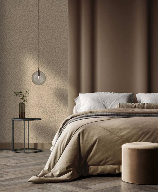 Een overal getextureerde wandbekleding, verrijkt met metalen luipaardvlekken die over een verhoogde acrylbasis vallen. De combinatie van glinsterend patroon en tastbare diepte creëert een gedurfde maar elegante, eigentijdse statementmuur.