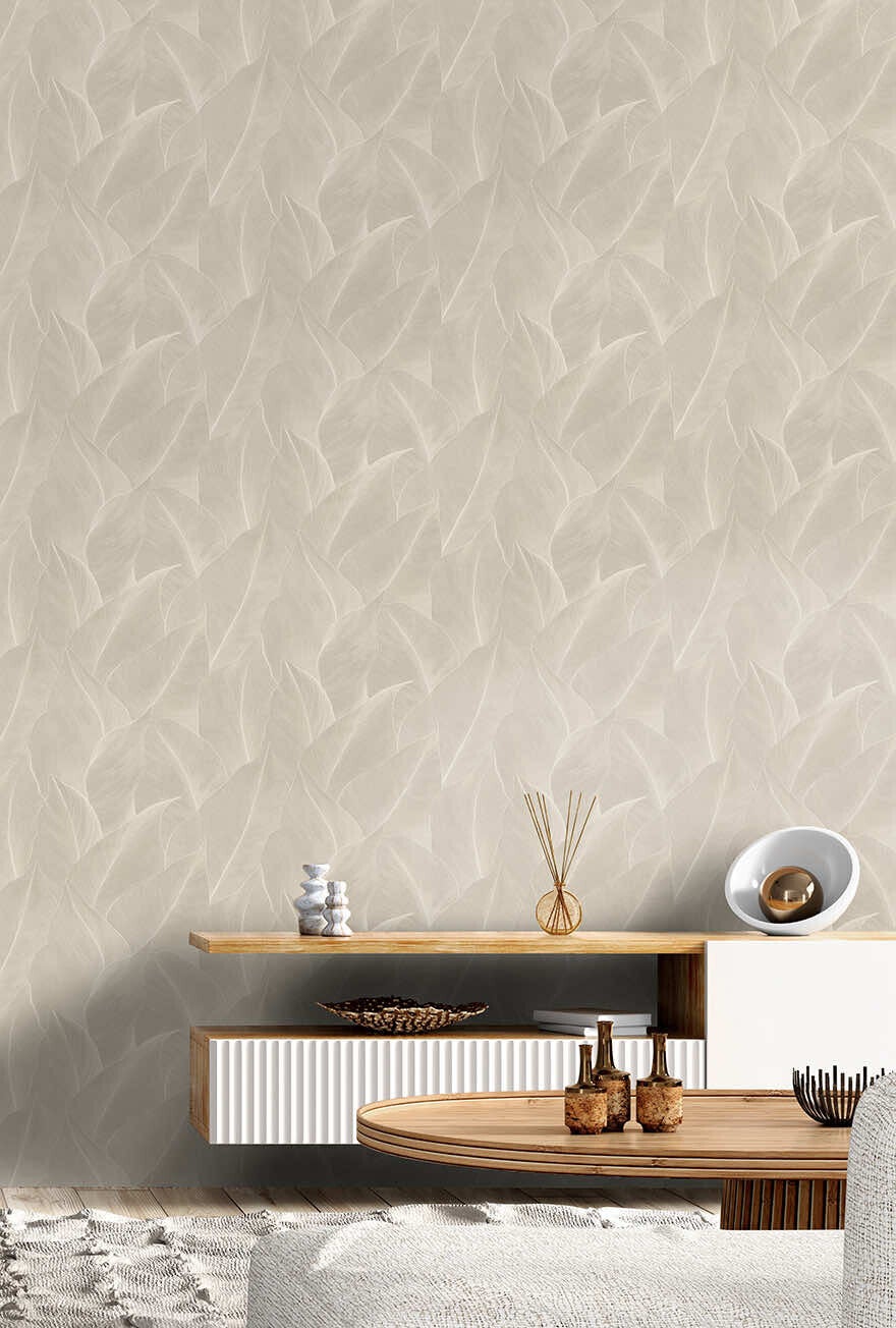 Een getextureerd allover-over-lineair blad, versterkt met een zachte mica-glans en verhoogde acryldetails. De combinatie voegt diepte, subtiele sprankeling en organische beweging toe—perfect voor een verfijnd, door de natuur geïnspireerd interieur.