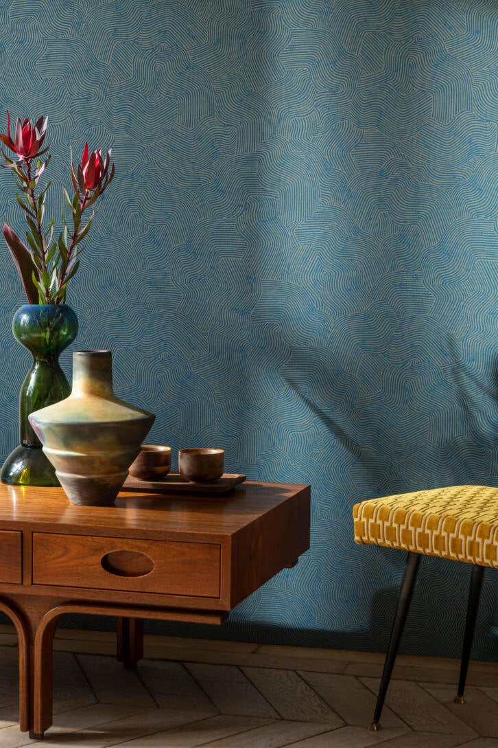 Breng een vleugje glamour en elegantie in huis met het prachtige Bahia behangdesign! Dit ontwerp is voorzien van een golvend grafisch patroon in een warme goudgele kleur, waardoor het een opvallende en luxueuze uitstraling heeft.