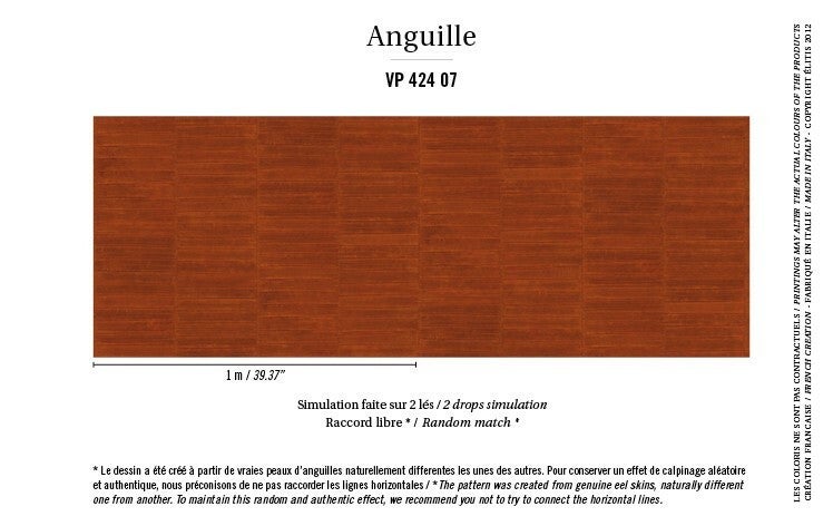 Tip: Het patroon van dit behang is gebaseerd op echte palinghuiden, die van nature verschillen. Om het unieke karakter te behouden, adviseren we u om de banen niet horizontaal aan te laten sluiten, maar juist verspringend.