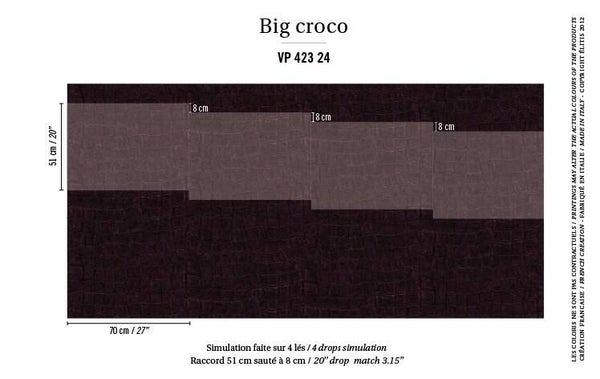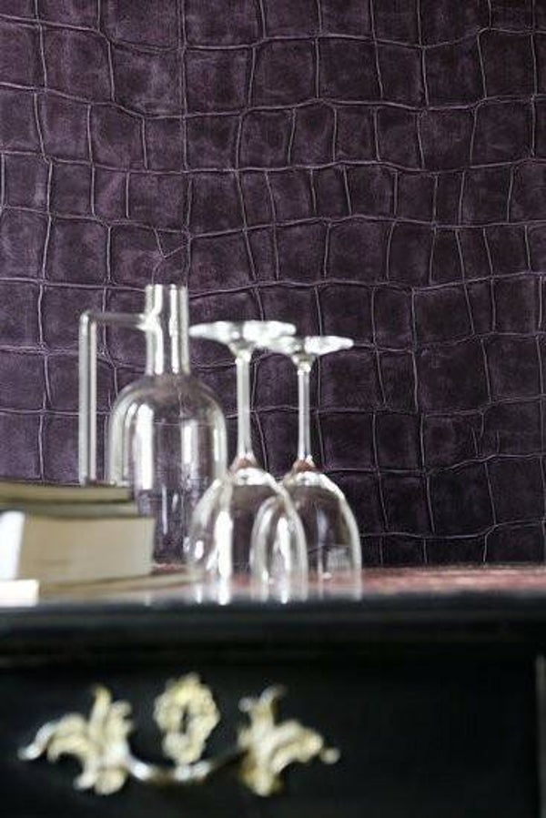 Merk: Elitis Big Croco behang Kleur: Donker paarsMateriaal: Vinyl Maat: Rollengte 10 meter, rolbreedte 70 centimeter, prijs per rol Patroonherhaling: 51 centimeter Onderhoud: Dit behang is met een spons afneembaar Levertijd: 5 tot 6 werkdagen