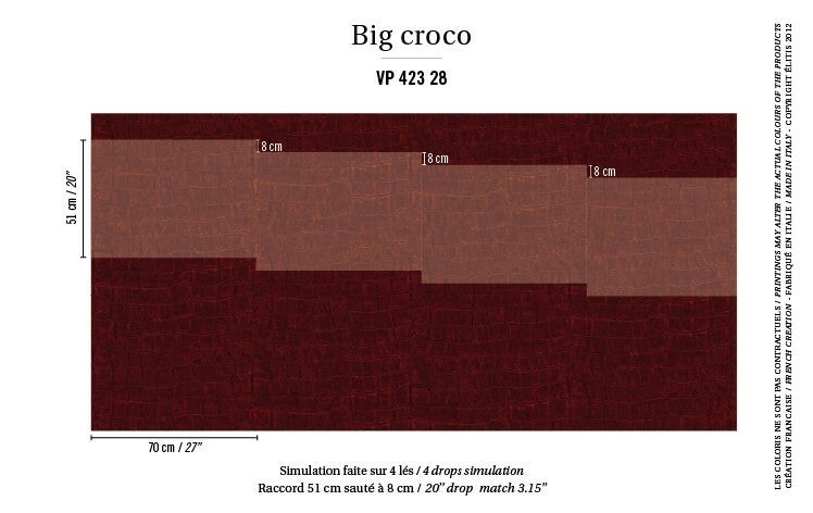 Merk: Elitis Big Croco behang Kleur: Donker rood Materiaal: Vinyl Maat: Rollengte 10 meter, rolbreedte 70 centimeter, prijs per rol Patroonherhaling: 51 centimeter Onderhoud: Dit behang is met een spons afneembaar Levertijd: 5 tot 6 werkdagen