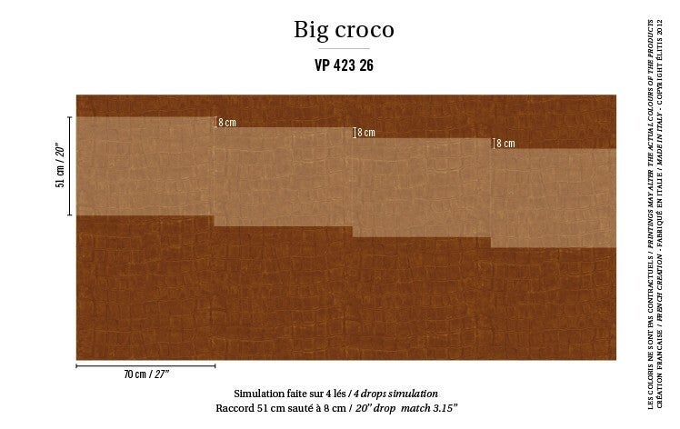 Merk: Elitis Big Croco behang Kleur: Licht bruin Materiaal: Vinyl Maat: Rollengte 10 meter, rolbreedte 70 centimeter, prijs per rol Patroonherhaling: 51 centimeter Onderhoud: Dit behang is met een spons afneembaar Levertijd: 5 tot 6 werkdagen