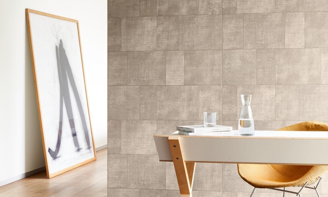 Je ontdekt een patchwork van onregelmatige rechthoeken. Imperfecties geven het patroon extra charme. De muurbekleding is gebaseerd op grof geweven linnen.
